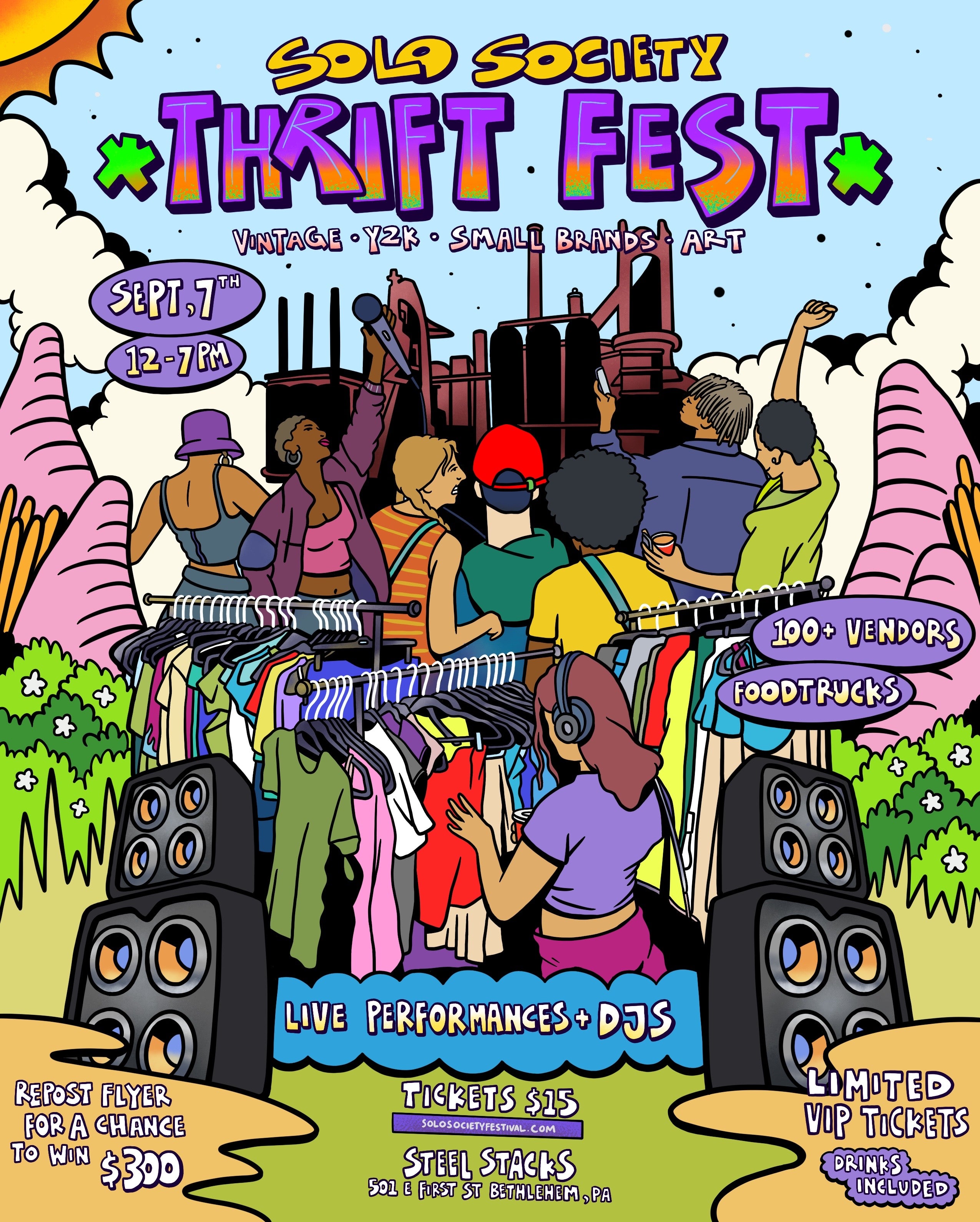 Solo Society Thrift Fest is a community event dedicated to promoting sustainability and self-expression through vintage and thrift fashion. Our event features over 100 vintage vendors, live music, and delicious food trucks.